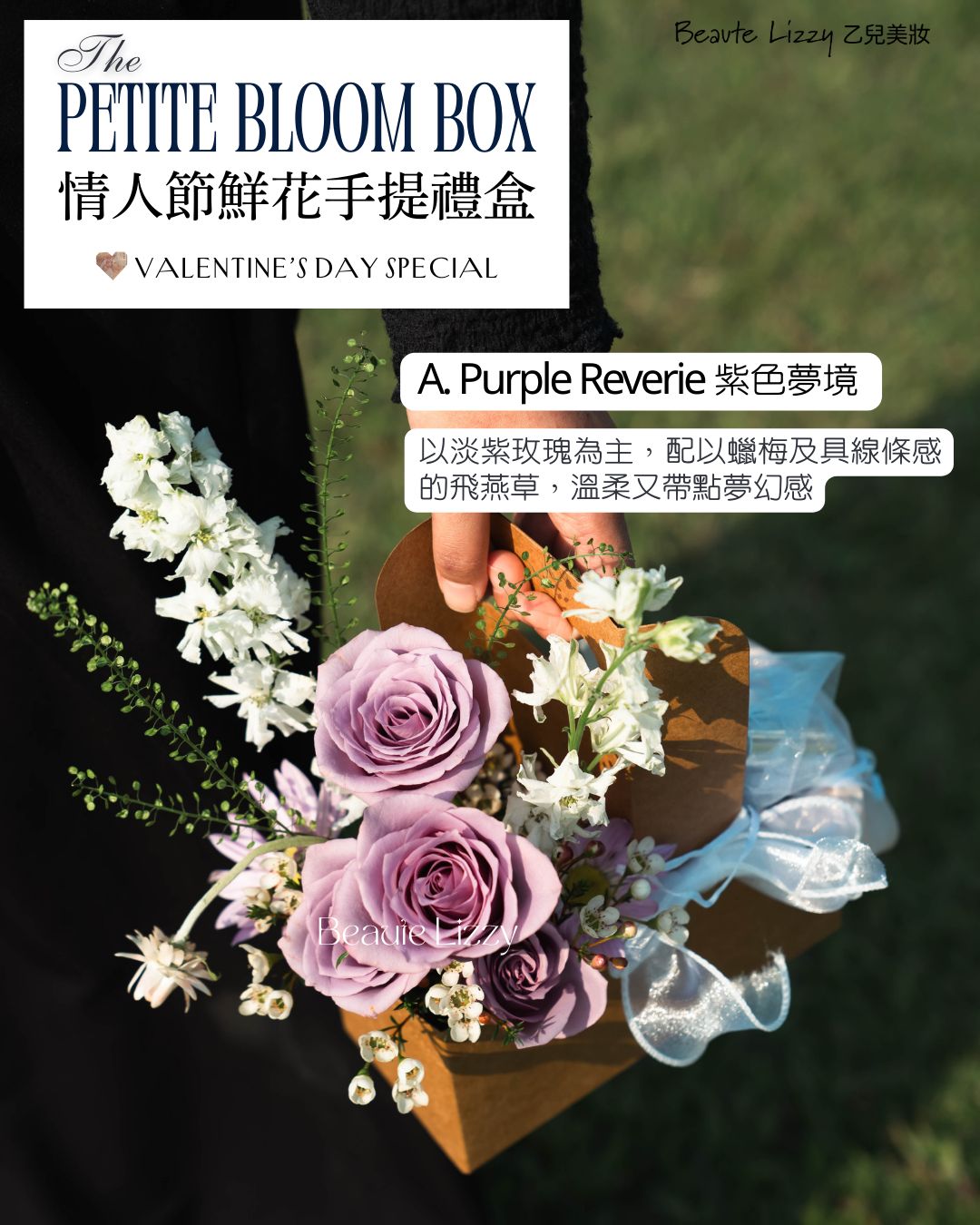 情人節鮮花手提禮盒💌 𝒕𝒉𝒆 𝑷𝒆𝒕𝒊𝒕𝒆 𝑩𝒍𝒐𝒐𝒎 𝑩𝒐𝒙 – Valentine’s Day Special – 🎀 情人節早鳥專享|$168 (原價 $180) 三款色調可選: 💜 Purple Reverie|紫色夢境 ❤️ Eternal Red|永恆的愛 🩷 Blush Petal|淡粉花語 ・價格僅包含鮮花花盒 ・需於 1 月 31 日前完成付款及確認訂單 ・2月11-15日於油麻地門市自取 ➕ 加購本店任選產品 2 件或以上, 即可享額外 95 折 (鮮花花盒不適用於此折扣) *門市可即場協助搭配香水 / 護膚/美容產品, 打造完整情人節禮盒 ——— 【小提醒】 ・花藝款式由花藝師依所選色調設計,恕不指定特定花材 ・手工製作,花型與色調或與圖片略有差異 ・鮮花屬自然產品,製作及配送過程中或出現輕微破損或擦傷,屬合理範圍,恕不設退款或退貨 ・花盒內含花泥,建議每 1–2 天補充少量清水。