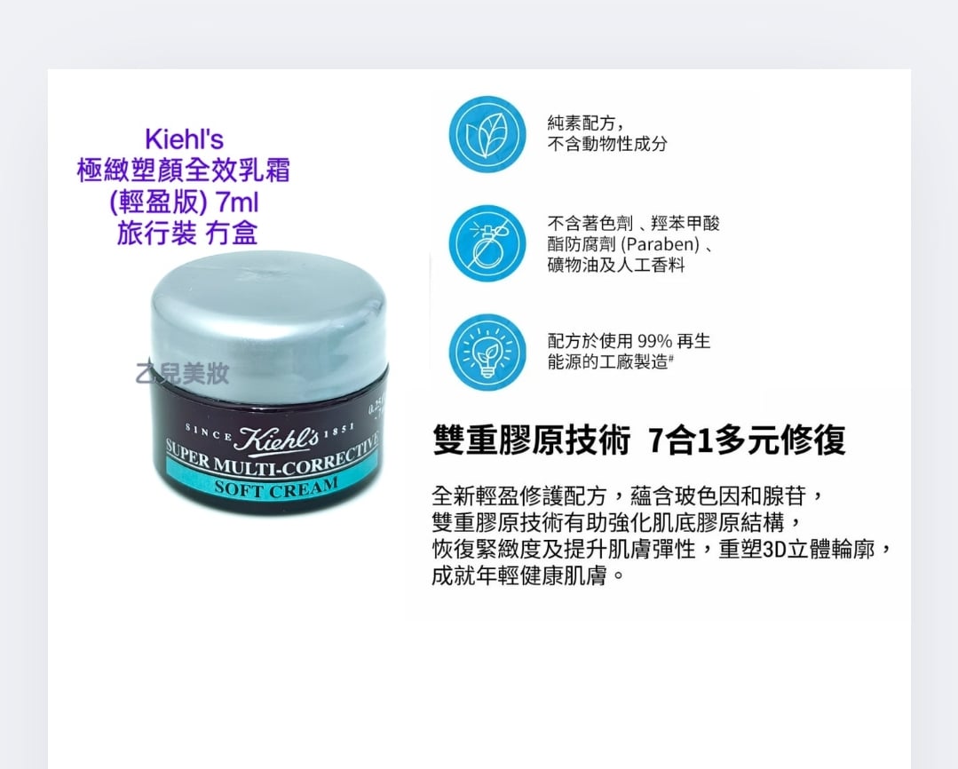 PD 12. 2023 ( 原50ml $6xx. ) Kiehl's 極緻塑顏全效乳霜 (輕盈版) Super Multi Corrective Soft Cream 7ml 旅行裝 冇盒 ✨雙重膠原技術 7合一多元修復 全新輕盈修護配方,蘊含玻色因和腺苷,雙重膠原技術有助強化肌底膠原結構,恢復緊緻度及提升肌膚彈性,重塑3D立體輪廓,成就年輕健康肌膚 。 使用 每天早晚潔面後,爽膚水,於精華後使用 將輕盈乳霜均勻塗抹在潔凈的皮膚上並按摩至面頰及頸部。
