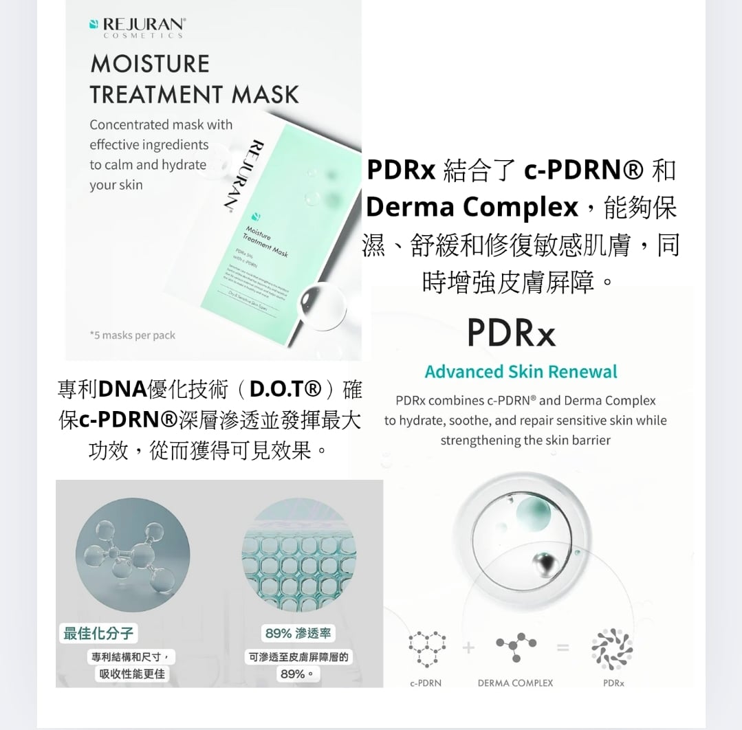 Exp 2028 Rejuran 麗珠蘭面膜 Moisture Treatment Mask PDRx 5% with c- PDRN 1盒5片