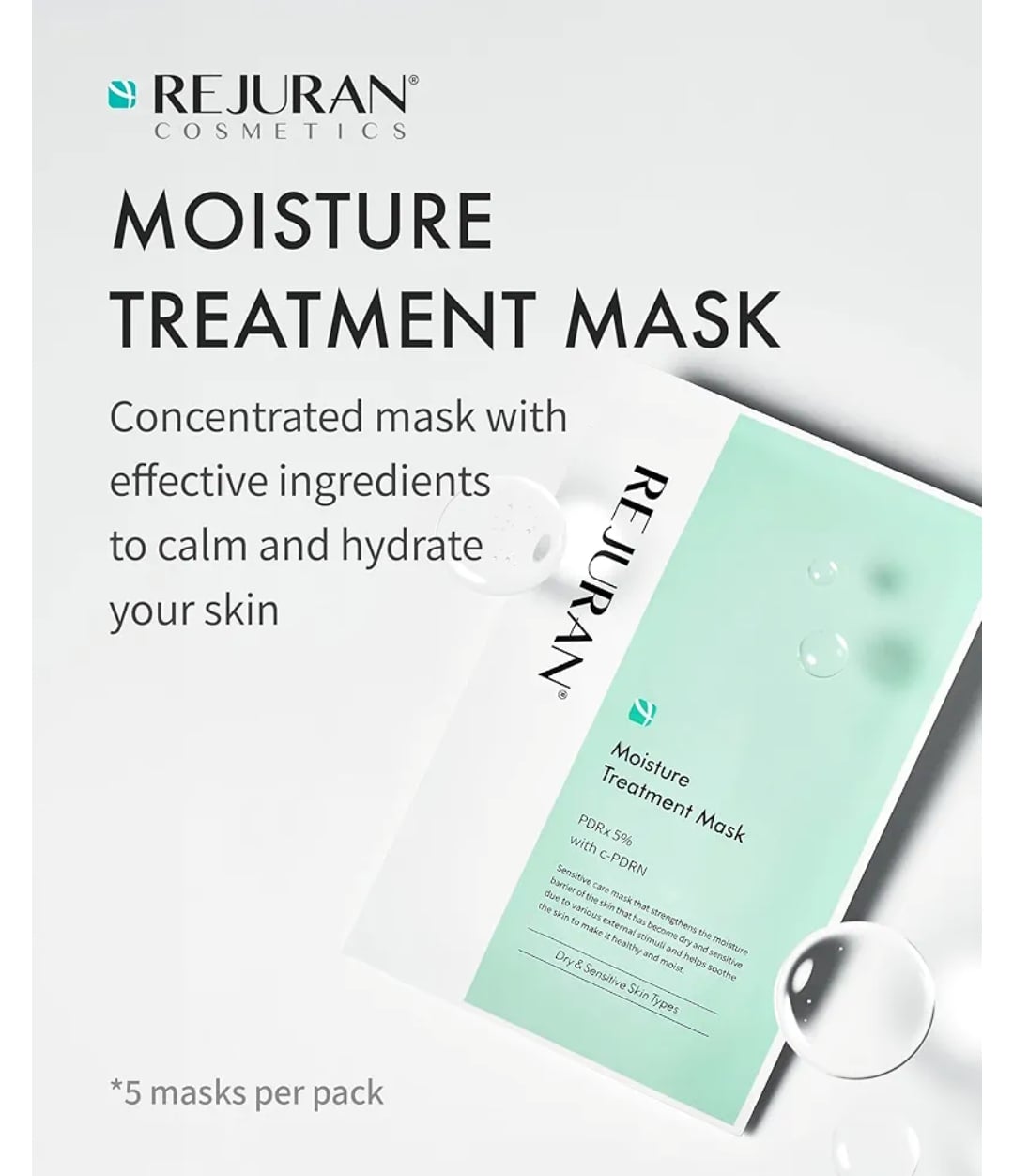 Rejuran 麗珠蘭 深層補濕修復面膜 Moisture Treatment Mask 1片 肌膚容易出現敏感人士或長期飽受乾燥問題,可由此入手,試用麗珠蘭保養系列。面膜蘊含50,000ppm PDRx,專用於肌膚屏障系統,模擬肌膚屏障系統,保持肌膚健康強韌。搭配尿囊素等屏障護理成分,為肌膚提供活性成分,調整受刺激的肌膚。吸收精華後會變成透明濃稠的肌膚狀,具有吸水性,緊密貼合肌膚。