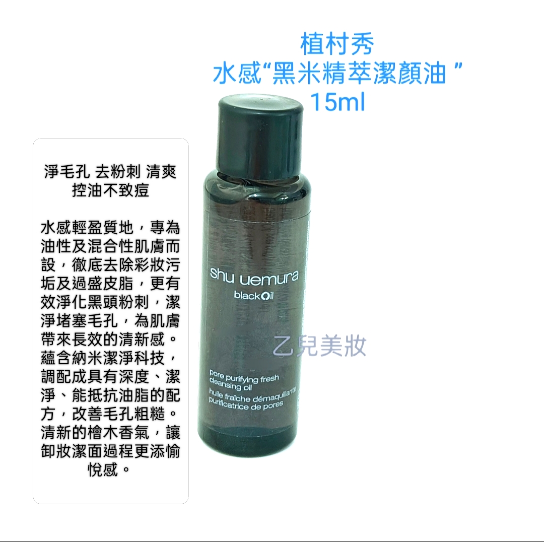 PD 11. 2023 ( 原 150ml $3xx. ) SHU UEMURA BLACK OIL 植村秀黑米精萃潔顏油 15ml 淨毛孔 去粉刺 清爽控油不致痘 水感輕盈質地,專為油性及混合性肌膚而設,徹底去除彩妝污垢及過盛皮脂,更有效淨化黑頭粉刺,潔淨堵塞毛孔,為肌膚帶來長效的清新感。蘊含納米潔淨科技,調配成具有深度、潔淨、能抵抗油脂的配方,改善毛孔粗糙。清新的檜木香氣,讓卸妝潔面過程更添愉悅感。